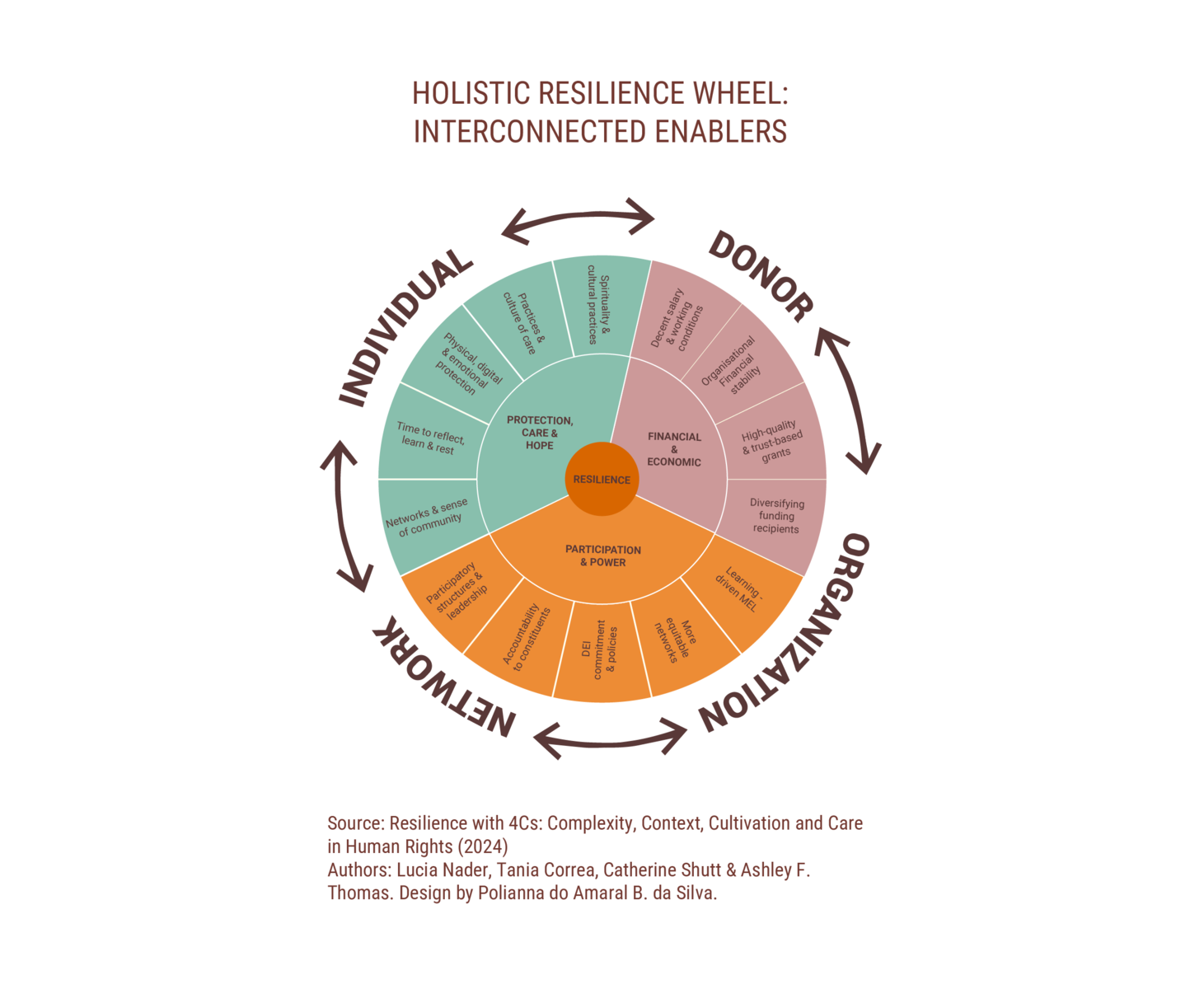 What we’ve come to call the Holistic Resilience Wheel captures this vision. It outlines 14 interconnected and mutually reinforcing conditions and capacities that help resilience take root and flourish. These enablers of resilience fall into three areas: Hope, Care, and Protection; Financial and Economic; and Participation and Power. As one activist noted, “There is more to resilience than organizational strengthening. It’s about the conditions that allow us to keep fighting—and healing—together.”