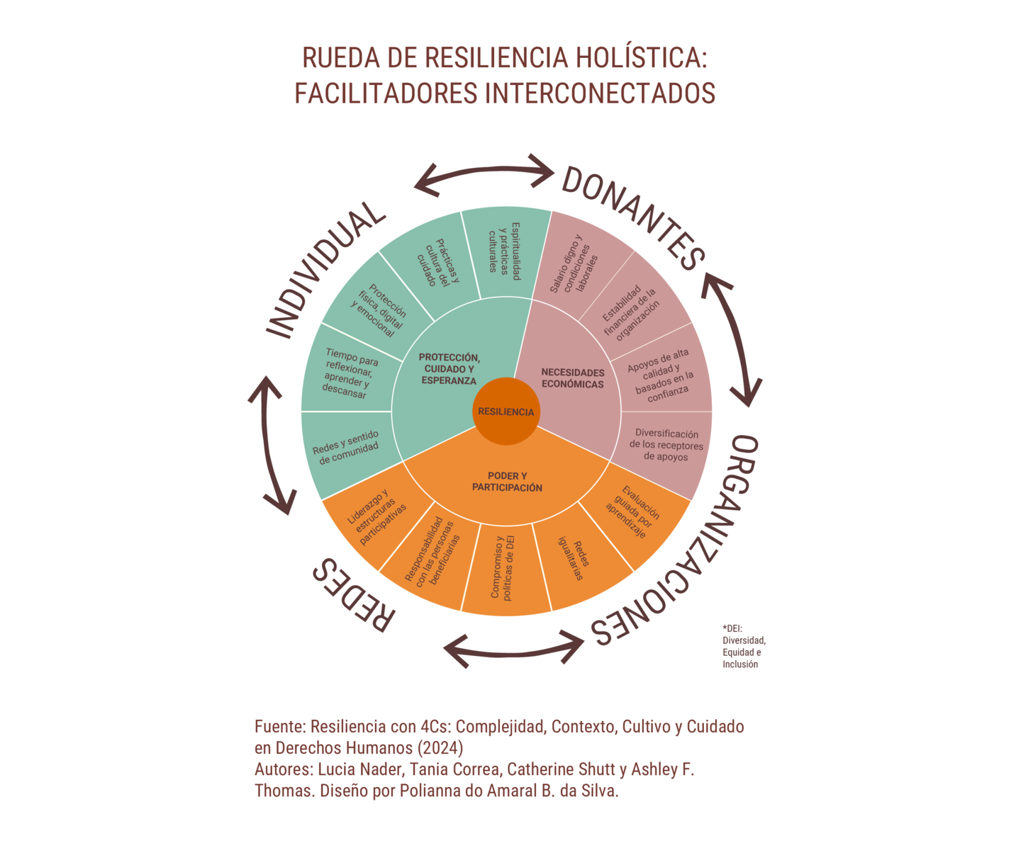 Lo que hemos llamado la Rueda de la Resiliencia Holística recoge esta visión. Describe 14 condiciones y capacidades interconectadas que se refuerzan mutuamente y que permiten que la resiliencia eche raíces y florezca. Estos facilitadores de la resiliencia se agrupan en tres ámbitos: esperanza, cuidado y protección; necesidades económicas y financieras; y poder y participación. Como señaló una activista: «La resiliencia es más que el fortalecimiento organizacional. Se trata de las condiciones que nos permiten seguir luchando —y sanando— juntas».